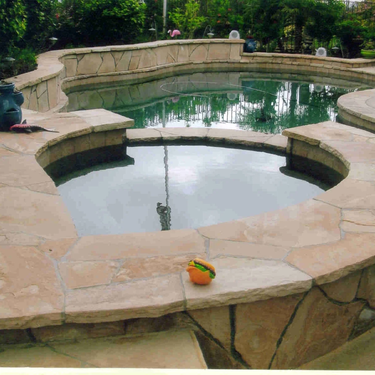 Flagstone pool coping and pool deck. This flagstone was also set on the planter surrounding the back of the pool.